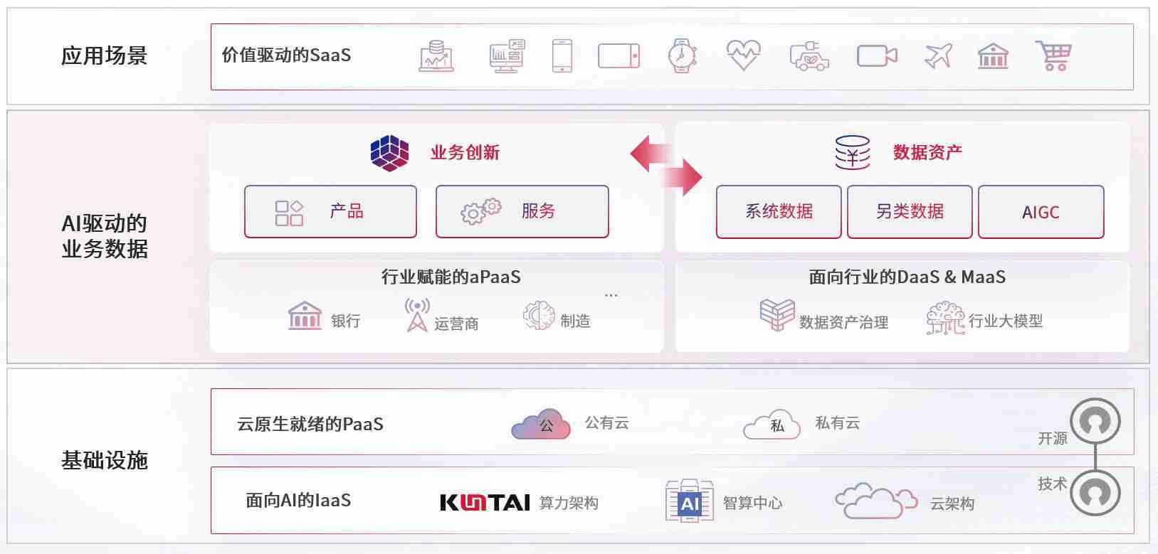 数字时代,,,,围绕企业数字化转型的关键要素,,AG尊龙凯时数码开创性的提出数云融合战略和技术体系框架,,,着力在云原生、、、、数字原生、、AI原生和信创产业上架构产品和服务能力,,为处在不同数字化转型阶段的快消零售、、、、汽车、、、、金融、、、、医疗、、、政企、、教育、、、、运营商等行业客户提供泛在的敏捷IT能力和融合的数据驱动能力,,,构建跨界融合创新的数字业务场景和新业务模式,,助力企业级客户建立面向未来的核心能力和竞争优势,,,全面推动社会的数字化、、智能化转型升级。。。。