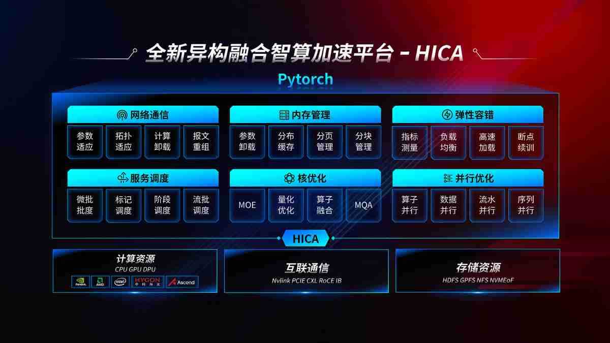 通过自研的服务层、、、中间适配层、、、、以及调度编排算法,,采用数据并行、、、、模型并行等多种并行方式,,,,把并行计算任务进行有效的分解,,,使其分别由相应的软件栈和算力资源来承接。。当GPU资源变化,,HICA可以实时动态调度计算子任务并调整模型拓扑和架构,,,,以充分聚合各种算力资源。。
